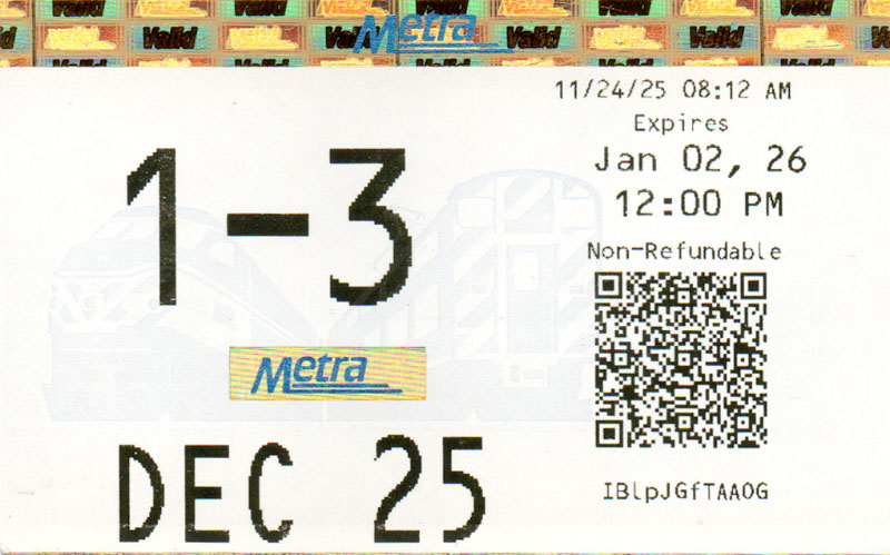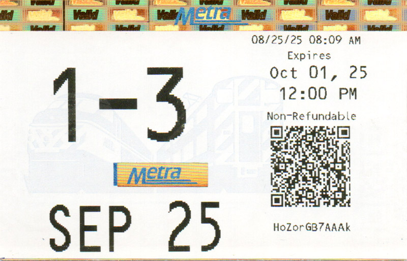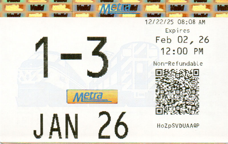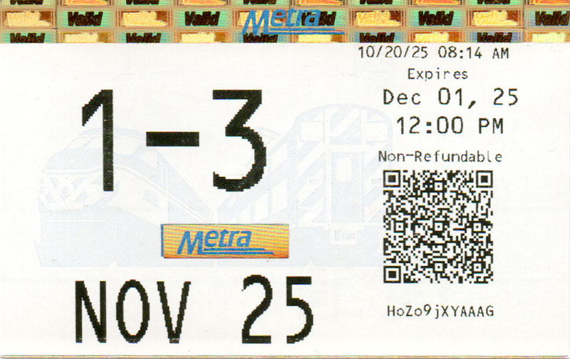 Below are scans of monthly train tickets Metra sells in and around Chicago. I started collecting them when I started riding the train in 2004 and thanks to generous donations from Metra and fellow riders, it’s grown by leaps and bounds. More about the tickets and why I’ve uploaded them are detailed in several blog posts: Metra ticket gallery updates, Metra tickets galore, and Metra ticket designs. I’m always looking for more tickets so please contact me if you have some.