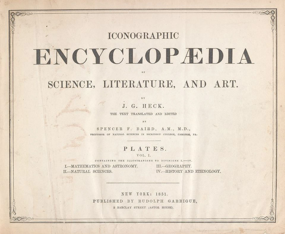 Published between 1849 and 1851, the 10-part collection comprised 500 steel engraved plates containing more than 13,000 illustrations and more than 1.6 million words of detailed descriptions. Originally titled Bilder-Atlas zum Conversations-Lexicon. Ikonographische Encyklopädie der Wissenschaften und Künste, it was released as a supplement to Brockhaus Enzyklopädie, a German encyclopedia. Between 1851 and 1852, it was translated to English as Iconographic Encyclopædia of Science, Literature, and Art and edited by Spencer Fullerton Baird, who would later become the first curator of the Smithsonian Institution.