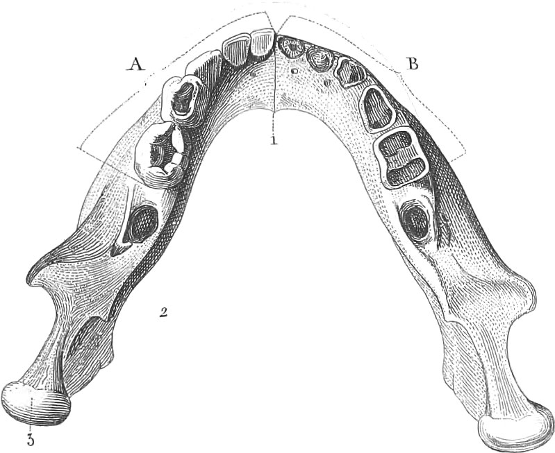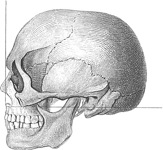 However great the resemblance between Man and the Quadrumana, yet the differences, as already remarked, are sufficient to prevent their ever being approximated more closely than we have done. Thus, a perfectly opposable thumb is unknown among the monkey tribe; this member, although, capable of grasping objects, is yet unable to act with the delicacy and precision so eminently characteristic in man. The erect attitude, too, is man’s sole prerogative; this involving numerous differences in general structure. Another point of difference is to be found in the different facial angle; this being such as to throw the face immediately beneath the brain, and not anterior to it. This facial angle is formed by two ideal lines, one drawn from the most projecting portion of the forehead to the anterior extremity of the alveolar margin of the upper jaw, the other extending from the latter point in a horizontal direction through the meatus auditorius externus. The development of brain will generally be found to bear a certain ratio to the obtuseness of this angle. Pl. 119, fig. 10, exhibits the facial angle of the European; fig. 11, that of the negro; and fig. 12, that of the orang-outang.