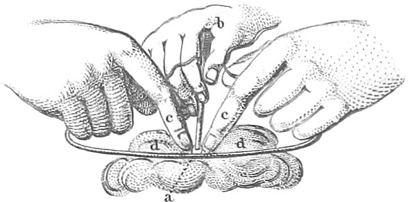 The apparatus necessary for tying an artery is much like that required in operations for aneurism: a straight edged scalpel (fig. 5), a Bromfield tenaculum artery forceps, aneurismal needle, &c. The artery is to be elevated by a tenaculum or forceps at or near the spot where the ligature is to be applied, and this passed beneath or over the artery to be severed and tied by an assistant (pl. 139, fig. 3, a, the vessel held by the surgeon with the forceps, b, the thread, d, d, passed round, and the knot tied by the assistant).