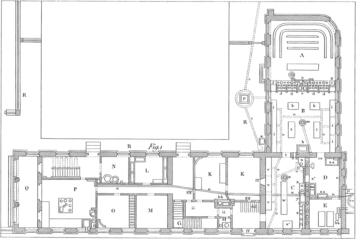 A, lecture room; B, analytical laboratory; C, pharmaceutical laboratory; D, instruments and library room; E, weighing room; G, steps to the second story; H, privy; KK, laboratory and cabinet of the director; L, room for preserving preparations; M, store room; N, washing room; O, room for the servants in the laboratory; P, old laboratory; Q, ante-chamber; R, yard and garden; a, black-board, capable of being raised or lowered; b, fireplace used in the lectures; c, iron door; d, closed fireplaces; e, table for nitrogen operations; f, door between laboratory and lecture room; g, potassium furnace; h, sand bath; i, work table with shelves; k, lower work table for minute operations; l, tables; m, stove; n, small water pipe; o, gutters for carrying off water; p, rain water cistern; r, pipes leading from the roof to the cistern; s, trap door for introducing coal into the coal cellar; t, door of communication; u, distilling apparatus; v, work table with shelves; v′, lower work table; w, table for using apparatus; x, fireplace with cooking vessels of different sizes; y, closed work table, for generating noxious gases; z, stove; z″, chimney; tz, two door communications; aa, book and instrument cases; bb, stove, whose pipe in winter heats the space for the water reservoir; cc, water reservoir; dd, steps to the coal cellar; ff, yard door; f′f′, window towards the laboratory; g′g′, window towards the old laboratory, P; hh, director’s fireplace; ii, passage towards the pharmaceutical laboratory and the privy.
