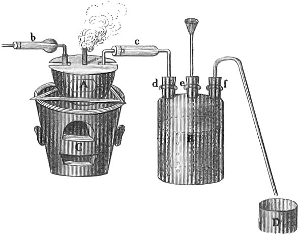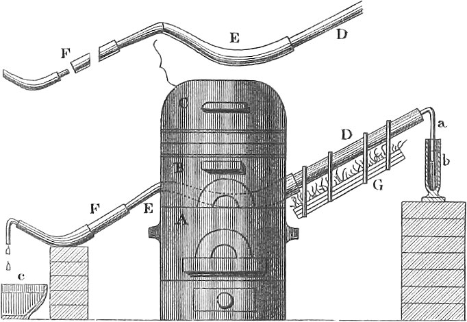 Apparatus for making anhydrous hydrocyanic or prussic acid (pl. 30, fig. 62). In the cylinder, b, the hydrochloric acid gas is generated, which enters through the tube, a, into the porcelain tube, D, in which cyanide of mercury has been laid, and where, by the decomposition of these two compounds, produced by the heat of the coal fire, G, prussic acid is generated. In the hollow, E, of the tubular extension of D, are placed pieces of chloride of calcium and chalk, kept cool by the snow with which the vessel, ABC, is filled for the purpose of condensing any watery vapor which might form, &c. The hydrocyanic acid vapor enters the tube, F, which is surrounded by an artificial freezing mixture, as of salt, snow, and dilute sulphuric aid; by this means the volatile acid is condensed.