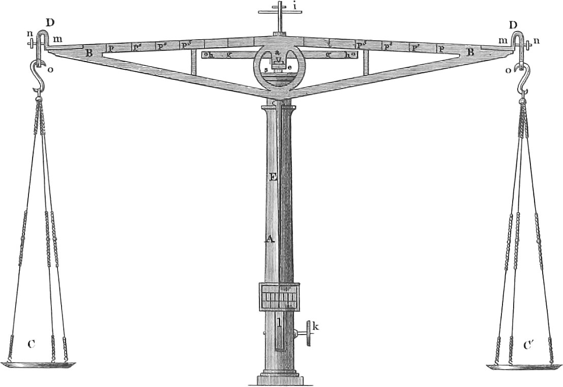 Pl. 30, fig. 70, represents the method of hanging the balance beam, which in the figure appears cut off at each end, so that only the two central pieces, BB, connected by the central annular body, are visible. a is a triangular prism of steel, the edge of whose lower acute angle rests on a plate of agate, b. It passes at right angles through the middle of the beam, supported at both extremities by agate plates. Both of these are carefully laid in the same plane, ee is a brass frame inclosing the body on which the agate plate rests. This frame can be raised or depressed by means of a pin connected with the excentric disk, el. When this frame is raised, it catches the very extremities of the knife edge in two opposite notches, and raises it with the beam from the agate plate. The figure represents only the anterior arrangement of the knife edge and agate plate, the posterior being precisely similar. When the knife edge is raised by the frame, ee, the two pins, hh, of an arm, gg, firmly connected with the frame, ee, catch at the same time under the scale beam, and support it still more.
