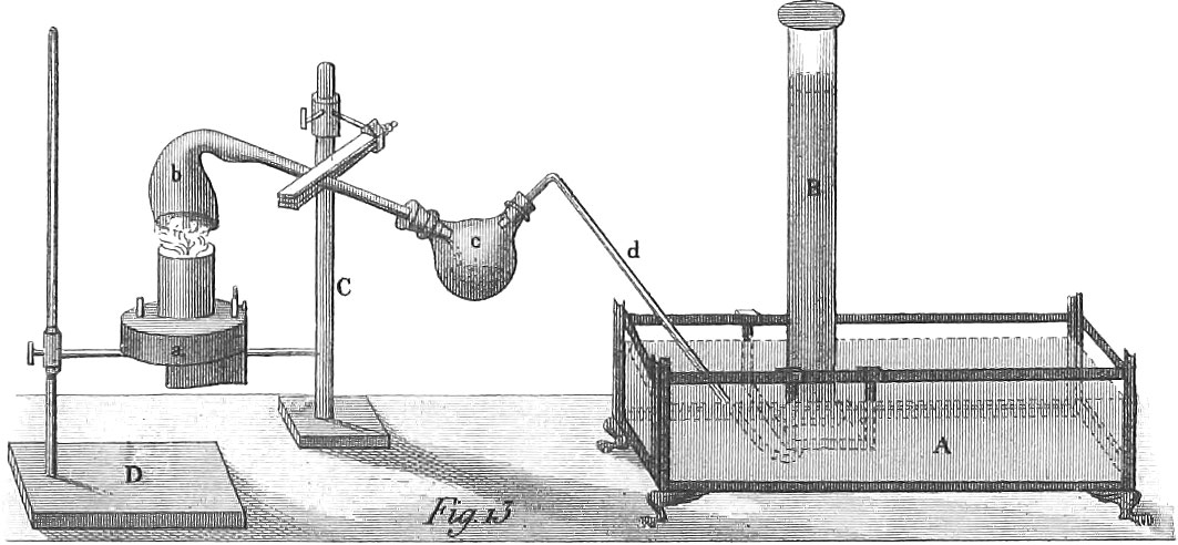 So intimate, however, is the mixture of oxygen and nitrogen in the air, that it is impossible to separate them by mechanical means; it therefore becomes necessary to do this by chemical agencies, which may also be applied in obtaining oxygen from other mixtures or compounds, the latter, in fact, being by far the best sources from which to procure the gas in question. Oxygen combines with almost all the other elementary bodies; at least, the only one in respect to which this fact has not been ascertained, is fluorine. To obtain oxygen pure, therefore, we may use one of several different combinations. Thus, for instance, we may select the protoxyde of mercury, a reddish substance, known in the arts as red precipitate. A sufficient quantity of this is introduced into the retort, b (pl. 31, fig. 13), the neck of this being firmly held by the clamp of the stand C. The neck of the retort terminates in the balloon, c. in which it is secured by a cork. From the second opening of this balloon a bent tube, d, passes into the water of the trough A. On one of the shelves of the trough is placed the receiver B, first filled with water, and then inverted so as to keep it entirely full; the end of the tube, d, must be just under the bottom of the receiver B. The inversion of the receiver, when filled with water, will be more practicable if the open end be closed by a plate of ground glass, which is to be removed under the surface of the water in the trough. After seeing that all the joints are rendered perfectly air-tight by means of the proper luting, a red heat is applied to the bottom of the retort by means of the spirit lamp a. At the temperature of a low red heat, the red oxyde of mercury is decomposed into its elements, and the gaseous oxygen first drives out the contained air through the conducting tube, d; for this reason the first bubbles, when formed, must be allowed to escape and not pass into the receiver. When all the air has been expelled, the succeeding oxygen passes from the end of the tube d, and rising through the water in a succession of bubbles, occupies the top of the receiver, displacing as much water as the space it occupies. When the receiver, B, is filled, it is to be removed to another shelf, and replaced by a new receiver, prepared like the last.