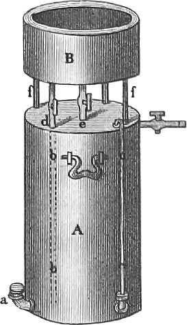 Pharmaceutical Extract Press. Pl. 30, fig. 65, represents the hydrostatic press as given by Real. Its object is to express the juice of plants under great pressure. For this purpose such substances are introduced into the space, A, on a sieve bottom over B, and the entire space, as well as the tube, C, filled with water. This tube is made several stories high and leads to some convenient part of the house. As soon as the column of water in C is brought into communication with the water in the cylinder, A, the column of water exerts a pressure corresponding to its height, on the substances placed in A, which are therefore more completely penetrated by water. The extract obtained is removed from beneath, after a proper time, by opening the cock, d.