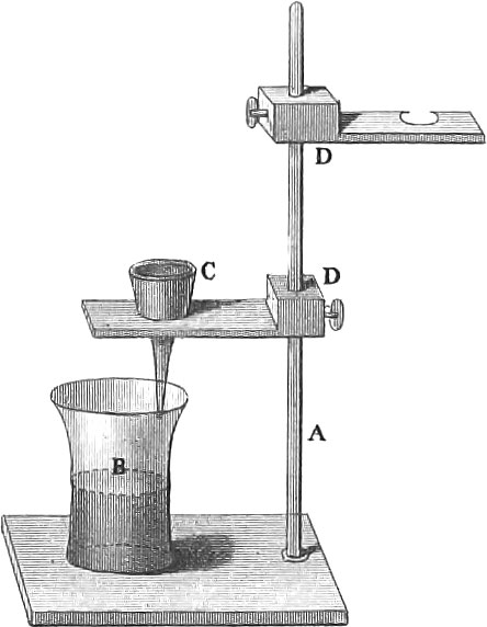 A simple filtering apparatus is shown by figs. 51 and 52. A represents the stand, B a tumbler into which the liquid is filtered, C the funnel, D differently arranged slides, which, by means of screws, can be fixed at any elevation on the vertical rod of the stand A.