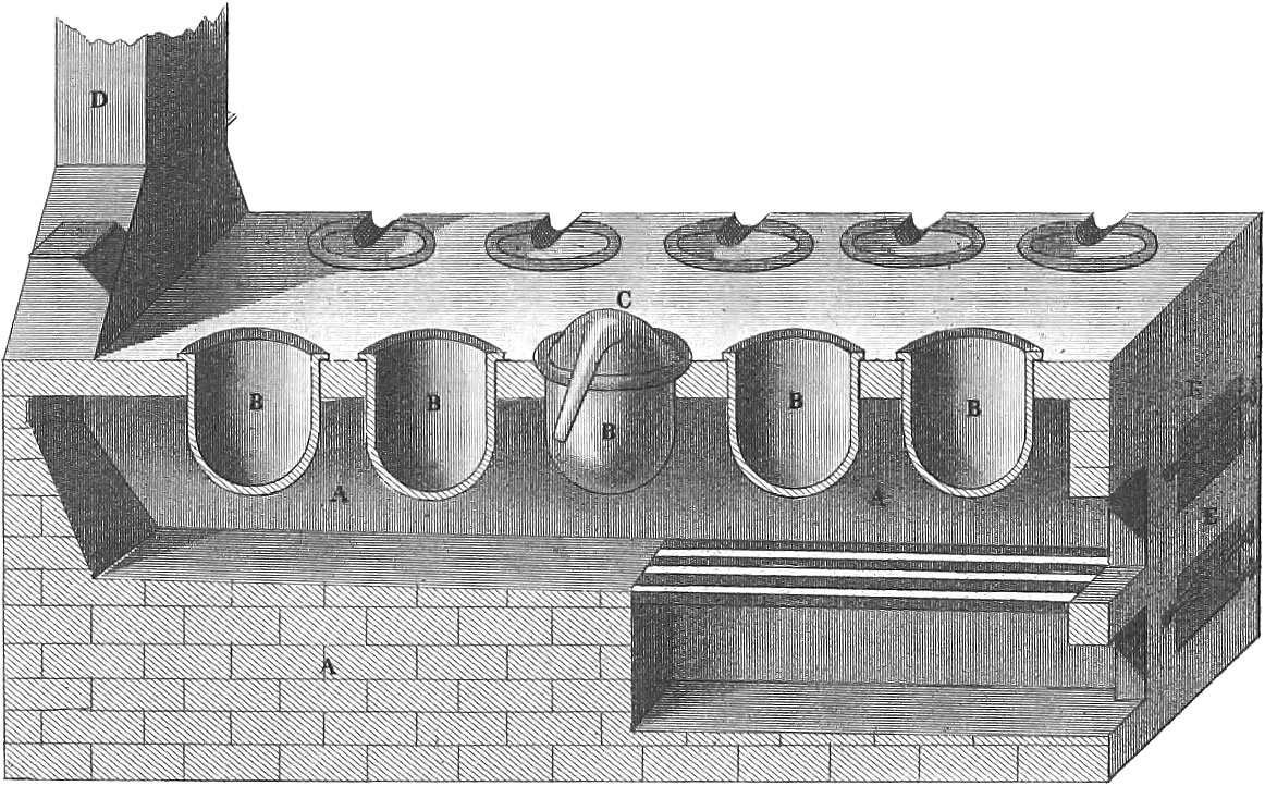 Fig. 15 represents the ground-plan of the fire space of the preceding apparatus. Fig. 16 is a copper vessel in the upper part of which is suspended a pan, and heated by being set in one of the openings in the upper plate of the boiler.