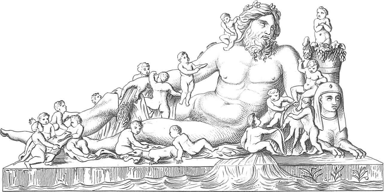 1. Nilus. The Nile (pl. 21, fig. 15a) is represented in the form of an old man reclining on a socle or low plinth, whose upper surface represents the waves. Nilus leans with one elbow on a sphinx and holds in his hand a cornucopia containing wheat-ears, grapes, wild roses, lotus flowers, the Egyptian arum, and a child with folded arms. The head of the god is crowned with the fruit and leaves of the lotus, and the right hand grasps a bunch of wheat-ears. Sixteen children sport over and around him, indicating that for the purpose of fertility the river must rise sixteen cubits. The genii at his feet are trying to bring on a fight between the ichneumon and the crocodile, others are covering the urn of the god with a heavy veil, to signify the obscurity of his sources or head waters. The two ends of the plinth (fig. 15b) support plants and various Egyptian animals, as bulls, crocodiles, hippopotamuses, the ibis, and ichneumon, and two boats manned by natives of Tentyra, who are contending with a crocodile and hippopotamus.