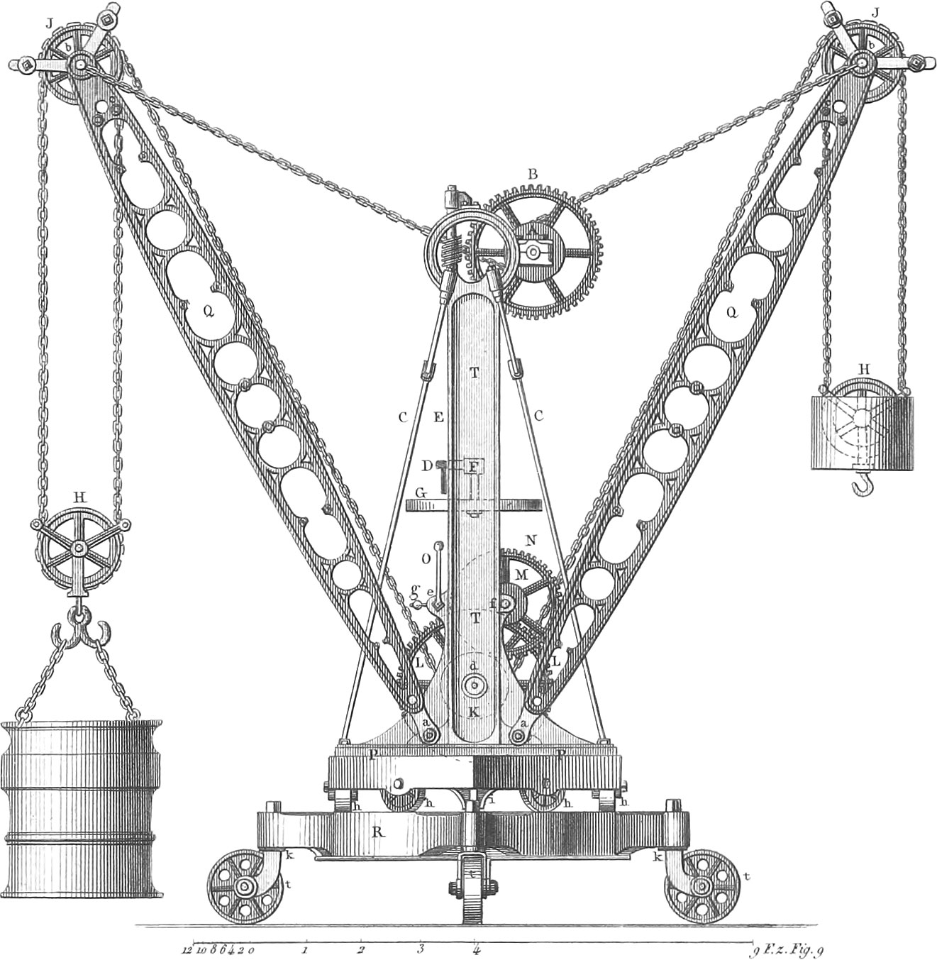 The machine represented in fig. 27 consists of a two-horse cart, a, of ordinary size, with two large wheels, b; the body of the cart hangs low between the wheels, and consists of two parts, the lower one of which can be taken off when full and exchanged for another. For this purpose it is suspended by chains passing over pulleys, k. Both pulleys are on the same axle, which also carries a cog-wheel that is moved by an endless screw, which may be turned by a crank or key in a place accessible to the driver. In this way the lower part or box which, when in use, is fastened by bolts, may be exchanged for another when required, and thus when the place of deposit is at a distance, the full boxes may be left and afterwards carried off together in a frame-cart. Through the bottom of a passes a pipe, the upper end of which reaches a little above the top of the full load of solid dirt; in the cart the fluid and solid parts will separate, and the former may be drained off into the sewers by opening the bottom of the pipe.