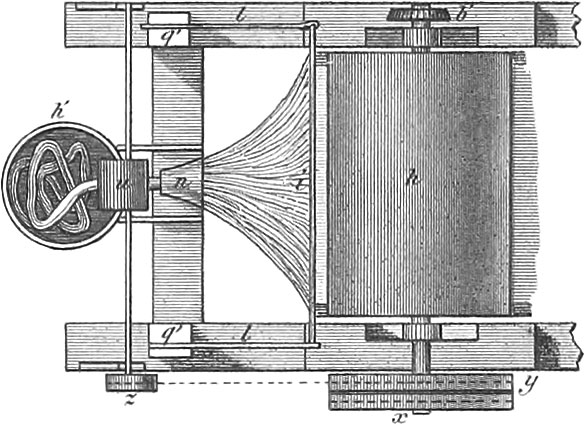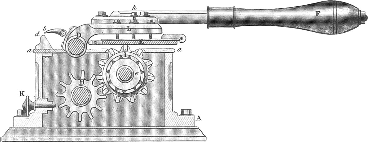 Sowing machines were first invented in Germany about the middle of the 17th century; since then they have been much improved in England and the United States. With nearly every machine for this purpose is united one or more small ploughs, to open the furrows, in which the seed is regularly distributed; they are so arranged that they may be placed to run deeper or more shallow, according to the nature of the seed to be planted, and to cut the furrows at such a width as may be required. There is also some arrangement attached to most of them for covering the seed. That portion of the apparatus which strews the seeds in the drills generally consists of a series of tubes reaching almost to the ground. Into these tubes the seed falls from a cylinder filled with holes, or is thrown in by small scoops upon an axis made to revolve in the seed-hopper; they are so arranged as to be adjustable more or less near to each other, and receive a slight shaking motion to secure the passage of the seed. In a seed-sower represented in fig. 30 the seed is fed to the funnel by a revolving cylinder, and there is an arrangement to stop the feed when the machine is turned. Hornly’s seed-planter, seen in fig. 36, is intended to sow all kinds of small grain, as also to distribute dry or liquid manure; it has ten seed-tubes, with the same number of ploughs or drills. The furrows are opened at the required distance apart, the seeds are dropped in them either continuously or at proper distances, and immediately covered. Fig. 29 is a more simple machine for drilling beans, which are dropped at certain required distances from each other; fig. 31 is a machine used for sowing clover-seed, and consists of a series of short perforated cylinders from which the seed is distributed with great regularity as it is drawn along the ground; this is said to be a labor and seed-saving machine, which performs its work well. Fig. 27 is a simple machine for drilling turnips, in which the feed-roller receives motion by a band from the axis of the machine.