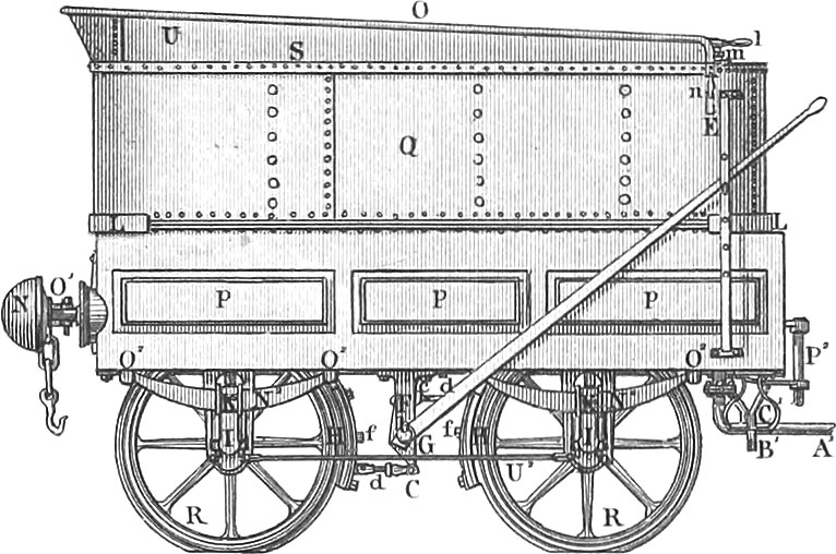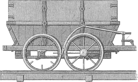 The distance between the rails must be greater by about \(\frac{3}{4}\) of an inch than that between the flanges of the wheels, so as to allow a play of \(\frac{3}{8}\) of an inch for each wheel, without which the friction would be too great. A larger play would prove destructive to the road and to the carriages by allowing the latter to rock violently from side to side. The flanges (pl. 5, fig. 14 c and fig. 12 a) are on the inside of the wheels and guard the carriages against sliding off the rails.