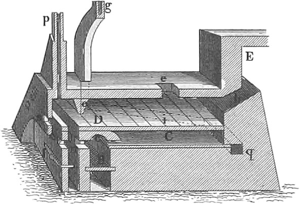 The drying of fruit can only be performed in dry weather, when this is done in the open air. When it is carried on upon a large scale, kilns built for the purpose become necessary. In pl. 30, fig. 35, is a plan of such a kiln, on the line, gh, of fig. 36; fig. 36, a vertical section upon the line, rs, of fig. 38; fig. 37, a transverse section on the line, gl, in fig. 38; fig. 38, a horizontal section on the line, gh, in fig. 36; and fig. 39 is a perspective view of one of the sliding frames for holding the fruit. Beneath the drying chamber is an oven, and at m are openings for the entrance of air which passes through tubes, x, to the fruit-chamber, and is again drawn off by the tube, l, and carried beneath the fire-grate to save fuel, and to increase the draught in the drying-chamber.
