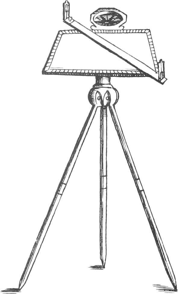 The Degrees thus intersect on the Frame, are of excellent use in wet or stormy Weather, when you cannot keep a Sheet of Paper upon the Table. Also these Degrees will make the Plain-Table a Theodolite, or a Semi-Circle, according as what side of the Frame is upper-most.