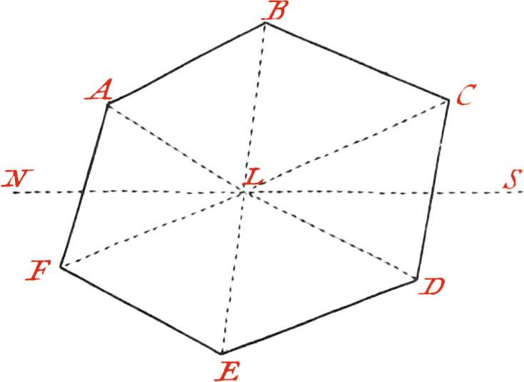 Upon one side of the said Box Frame, are projected the 360 Degrees of a Circle from a Brass Center-Hole in the Middle of the Table. Each of these Degrees are subdivided into 30 Minutes; to every 10th Degree is set two Numbers, one expressing the proper Number of Degrees, and the other the Complement of that Number of Degrees to 360. This is done to avoid the trouble of Substraction in taking of Angles.