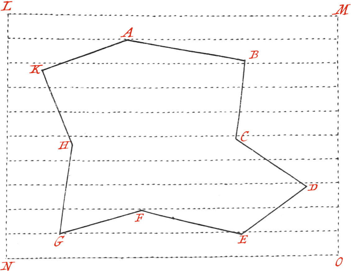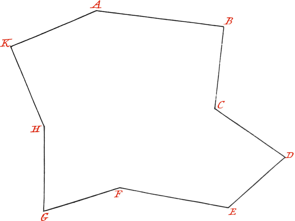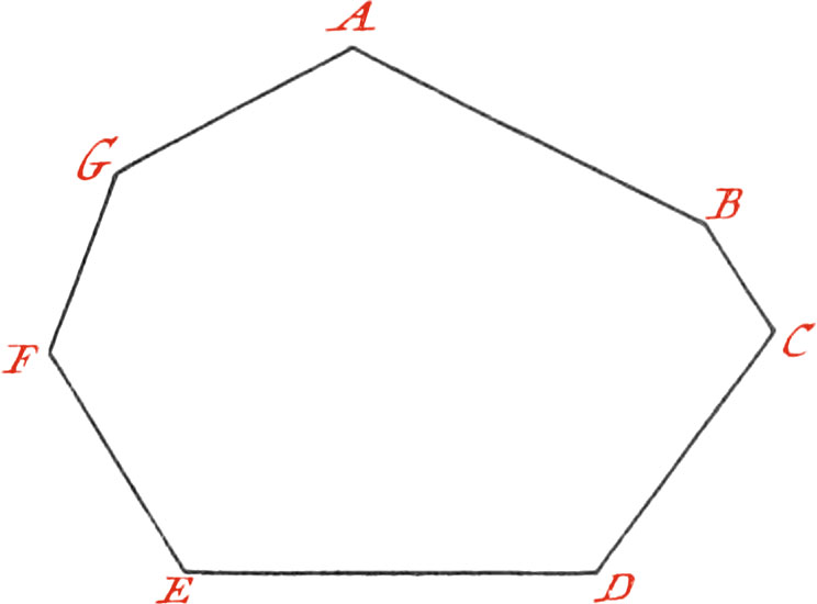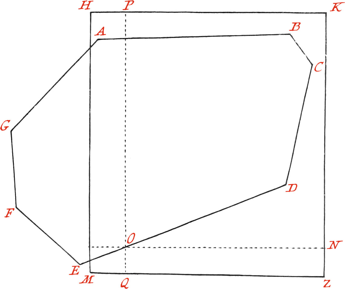 The Table itself is a Parallelogram of Oak, or other Wood, about 15 Inches long, and 12 broad, consisting of two several Boards, round which are Ledges of the same Wood; the two opposite of which being taken off, and the Spangle unskrewed from the Bottom, the aforesaid two Boards may be taken asunder for ease and conveniency of Carriage. For the binding of the two Boards and Ledges fast, when the Table is set together, there is a Box Jointed-Frame, about \(\frac{3}{4}\) of an Inch broad, and of the same thickness as the Boards, which may be folded together in 6 Pieces. This Frame is so contrived, that it may be taken off and put on the Table at pleasure, and may go easily on the Table, either side being upwards. This Frame also is to fasten a Sheet of Paper upon the Table, by forcing down the Frame, and squeezing in all the Edges of the Paper; so that it lies firm and even upon the Table, that thereby the Plot of a Field, or other Inclosure, may conveniently be drawn upon it.