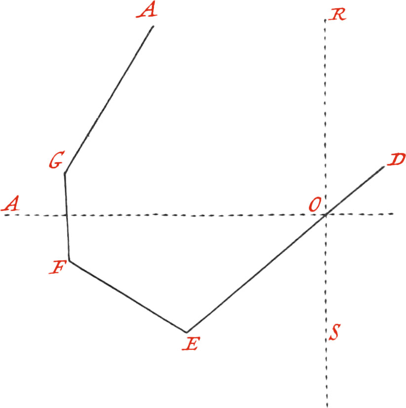 On the other Side of this Frame, are projected the 180 Degrees of a Semi-Circle from a Brass Center-Hole, in the Middle of the Table’s length, and about a fourth Part of it’s breadth. Each of these Degrees are subdivided into 30 Minutes; to every 10th Degree is set likewise, as on the other side, two Numbers; one expressing the proper Number of Degrees, and the other the Complement of that Number of Degrees to 180, for the same Reason, as before.