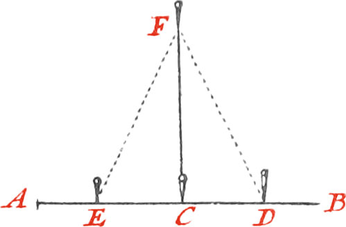 Plant a Staff in the Point C, and two others, as E, D, in the same Line, equally distant from Point C; then fasten the two Ends of a Line to the two Staves E, D, and fold the Line into two equal Prats in F; afterwards stretch the Line tight, and at the Point F plant a Staff, and the line FC will be perpendicular to AB.