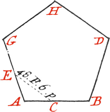 You will find that the Angles formed by the Sides of a Pentagon, are each 108 Degrees; (as before has been said, in Use 3. of the Protractor, and in the third Section, concerning the Line of Polygons of the Sector); therefore seek for, in the Table of Plane Angles, the Number that answers to 108 Degrees, or nighly approaches it, and you will find 48 Feet, and something above 6 Inches: for that Number answers to 107 Deg. 52 Min. which is lesser by 8 Min. than 108 Degrees; whence 48 Feet, 6\(\frac{1}{2}\) Inches, may be taken for the aforesaid Base.