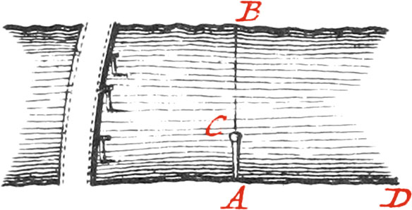 Let it be proposed, for Example, to find the Breadth AB of a River: being at one of it’s Sides A, plant there a Staff AC, 4 or 5 Feet high, and very upright; make a Slit towards the Top of the Staff, in which put a very straight Piece of Steel or Brass (that may slide up and down), about 3 Inches long, which must be slipped up or down, ’till the Point B, on the other Side of the River be seen along it; afterwards turn the Staff, and look along (keeping the aforesaid Piece of Brass in the same Position) the Side of the River upon level Ground, ’till you see the Point D, where the visual Rays terminate. The Distance AD measured with a Chain, will give the Breadth of the River, to which it is equal.