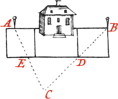 Find, upon very level Ground, a third Point, as C, from which you may see Staffs planted in the Points A and B; then measure exactly the Distance from C to A, and from C to B: this being done, take the Half, Third, or any other Part of each of those Lines, whereat plant Staffs, as in D bisecting CB, and in E bisecting CA; then draw a right Line from D to E, which produce as is necessary, and draw a Parallel to it passing by the Points A and B, by means of Staffs planted between the Point A and the House, as also between the House and the Point B, which will shew the Direction from A to B.