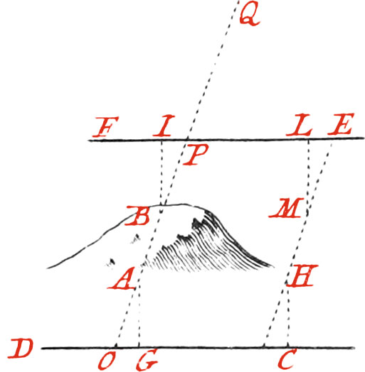 Draw on one Side of the Hill a right Line, as DC, and on the other Side another right Line, as EF, parallel to CD; then let fall from the Point A, to the Line CD, the Perpendicular AG; and in some other Point beyond the Hill, draw another Perpendicular, as CH, equal to AG.