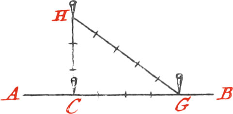 Otherwise; measure 4 Feet, or 4 Toises, from the Point C, on the Line AB, and the plant there the Staff G; take a Line containing 8 Feet, or 8 Toises (according as the former are Feet or Toises) fasten one End of the Line to the Staff C, and the other to the Staff G; then stretch the Line, so that 3 of those Parts be next to the Point C, and 5 next to G; plant a Staff in H, and the line HC will be perpendicular to AB.