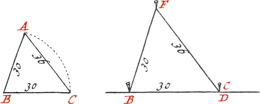 Let the given Angle upon the Ground be FBC; measure 30 Feet, or 5 Toises, from B towards C, at the End of which plant the Staff D; measure likewise 30 Feet from B towards F, and there plant another Staff; measure also the Distance of the Staffs F, D, which suppose will be 36 Feet (as in Use VI.).
