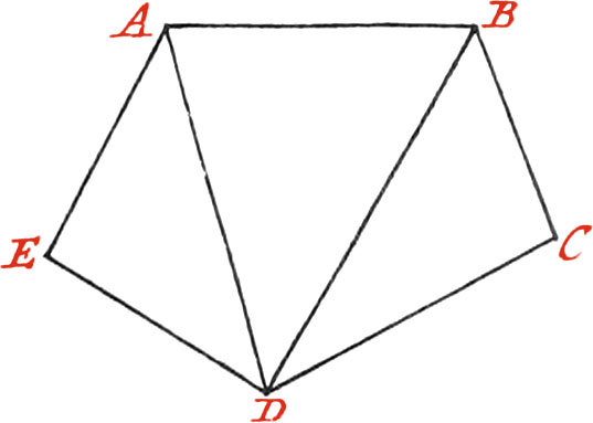 First, make a Figure upon your Paper, something like the Plan to be taken, and after having measured with a Toise the Sides AB, BC, CD, DE, and EA, write the Lengths found upon each of their corresponding Lines on the Paper; then instead of measuring the Angles made by the Sides, measure the Diagonals AD, BD, which write down in your Book, and the Figure will be reduced into three Triangles, whose Sides are all known, because they have been actually measured. Then the Figure must be drawn neat in your Book by means of a Scale of equal Parts.