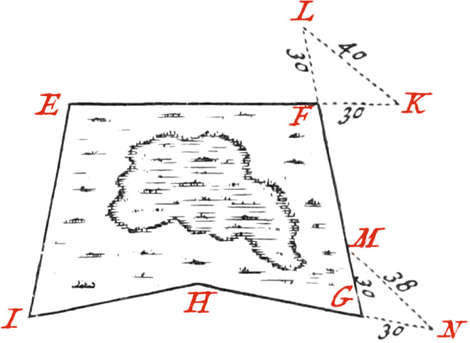 To measure, for Example, the Angle EFG, produce the Side EF, 5 Toises, and plant a Staff at the End K; produce also the Side GF, the Length of 5 Toises, and plant a Staff at the End L. Measure the Distance LK, and supposing it 6 Toises, 4 Feet, that is 40 Feet, set it down upon the Line LK in your Book, by which means the three Sides of the Isosceles Triangle LFK will be had; and consequently the Angle LFK, may be known by the aforementioned Table, or otherwise. Now the aforesaid Angle is equal to it’s opposite one EFG, and if you seek 40 Feet in the Column of Bases, the Angle will be found 83 Deg. 37 Min.