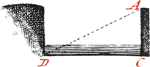 Place the Quadrant upon the Brink in the Point A, so that you may see thro’ the Sights the Bottom of the Ditch, at the Point D; then find the Angle made by the Thread upon the Limb, which suppose is 63 Degrees, and measure the Depth AC, from the Center of the Quadrant, which suppose 25 Feet; then make a similar right-angled Triangle, one of whose acute Angles is 63 Degrees (and consequently the other will be 27 Degrees), and the least Side is 25 Parts of some Scale. Lastly, measure with the same Scale the Side CD, which will be about 49; therefore the Breadth of the Ditch is 49 Feet.
