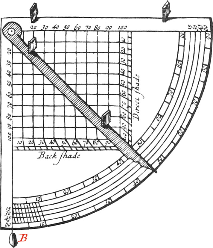 It is commonly made of Brass, or other solid Matter, 12 or 15 Inches Radius, and an answerable Thickness. It’s Circumference is first divided into 90 Degrees, and every Degree into as many equal Parts as possible, without Confusion, and in such manner, that the Divisions and Subdivisions may be just, and very distinctly marked upon the Limb of the Instrument.