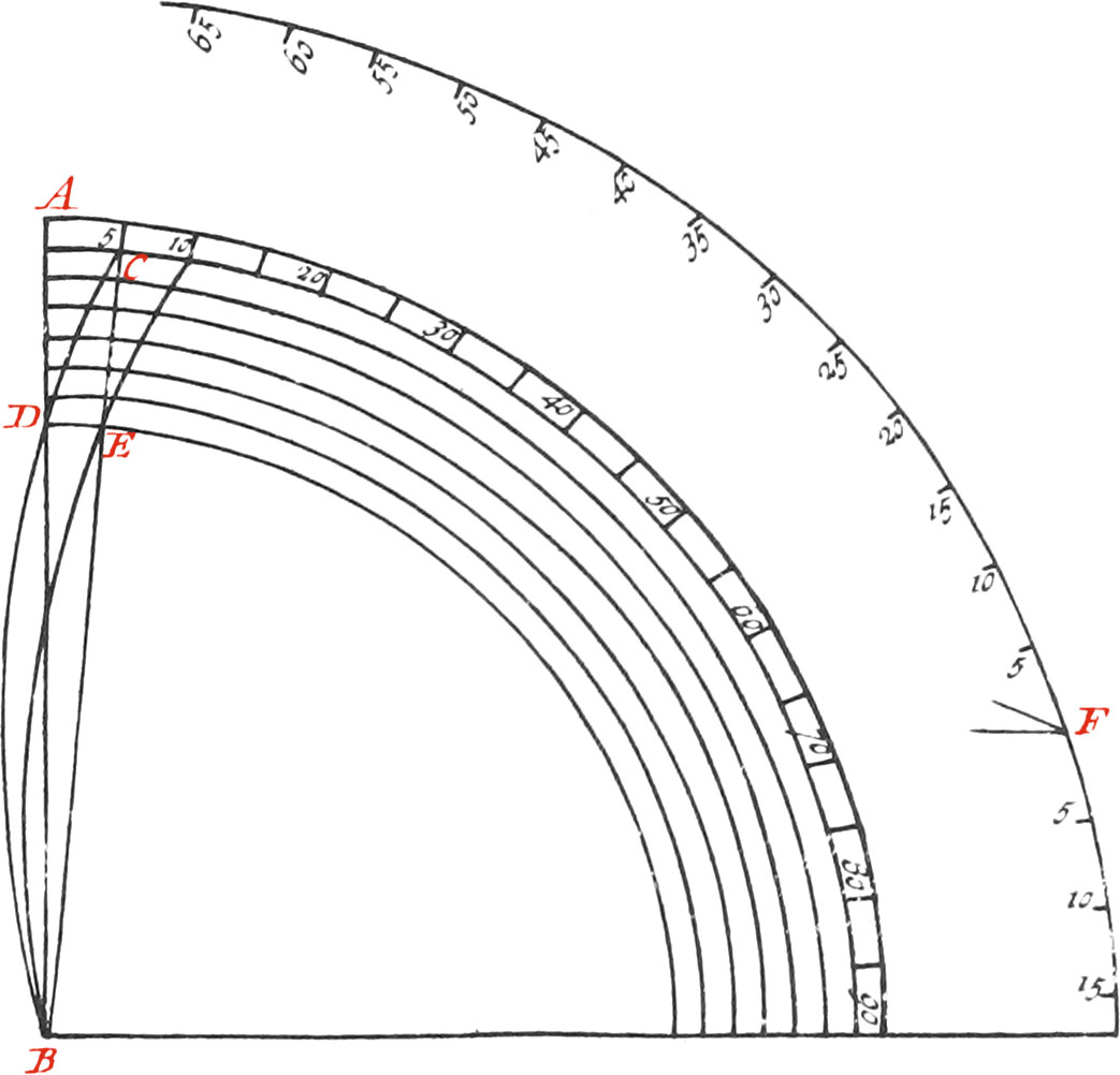 But since it is troublesome to find the Centers of 90 Arcs, each passing thro’ 3 Points; and since it is manifest, that all the Centers of these Arcs ought to be placed in the Circumference of a Circle whose Center is the Point B; there is no more to do but draw a Circle from the Center B, with the Distance BF, and divide it’s Circumference into 360 equal Parts; upon every of which, setting one Foot of your Compasses, you may describe with the same Extent FB, all the Arcs between the Circles AC, DE, and then the circular Arcs; which are Diagonals, will likewise divide the Circumferences, upon the Limb of the Instrument, into Degrees. Note, Because the Figure is too little, it is divided but into every 5th Degree.