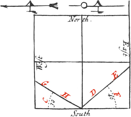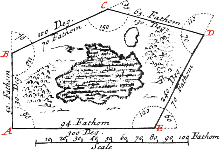 This Instrument is also very useful to People working in Quarries, and Mines under Ground; for having noted upon the Ground the Point directly over that you have a mind to go to, you must place the Compass at the Entrance into the Quarry or Mine, and observe the Angle made by the Needle with the Line of Direction: then when you are under Ground, you must make a Trench, making an Angle with the Needle equal to the aforesaid Angle; by means of which you may come to the proposed Place under Ground. There are several other Uses of this Instrument, the principal of which we are now going to speak.