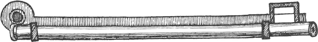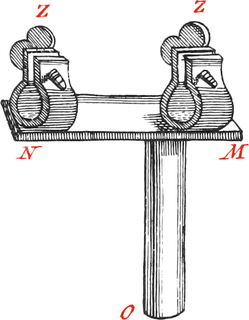Now because the principal Use of this Instrument is for taking the Altitudes of the Sun or Stars, it must be so ordered, that it’s Plane may be easily placed in a vertical Situation; therefore an Iron Ruler MN must be prepared, whole Thickness is three Lines, Length eight Inches, and Breadth one Inch, or thereabouts. On one Side of this Ruler are adjusted two Iron Rings ZZ, open a-top with Ears, each of which has a Screw to draw the Ears closer together, which have a Spring. The Bigness of these Rings is nearly equal to the Thickness of the Cylinder I, or Axis of the Quadrant, which being put thro’ them, is made fast with the Screws; so that the Axis and Quadrant, which it is fixed to, may remain firm in any Position the Quadrant is put into.