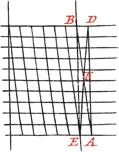 The Divisions on the Limb of this Quadrant ought to be made with great Care, that so Observations may thereby be exactly taken. Each Degree is divided into 60 Minutes, by means of 11 concentrick Circles, and 6 Diagonal right Lines, as in Figure 6 may be seen. These Diagonal Distances are equal between themselves, but those of the Concentrick Circles are unequal; yet this Inequality is not sensible, if the Radius of the Quadrant be three Feet, and the Distance between the two outmost concentrick Circles be one Inch; for if the Arc AE, of the outmost Circle be 10 Minutes, and there are drawn, from the Center C of the Quadrant, the Radii ADC, EBC, meeting the inner concentrick Circle in the Points D, B, the Arc DB will be likewise 10 Minutes. Note, Figure 6 is supposed to be put upon the Limb of the Instrument, Figure 1.