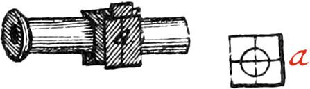 Upon the Surface of this Plate, represented by the Figure a, are continued out two Diameters of the aforesaid Hole, eroding each other at Right Angles, one of which is parallel to the Limb, and the other perpendicular thereto, upon which are placed the Cross-Hairs. This Plate is very useful for moving the said Cross-Hairs, strained at Right Angles a-cross the Middle of the Hole, backwards or forwards, according to necessity. And when the Hairs are placed as they should be, the aforesaid Plate is fixed to the Box with Wax, which ought to be furnished with a sliding Cover, for keeping the Cross-Hairs from Accidents.