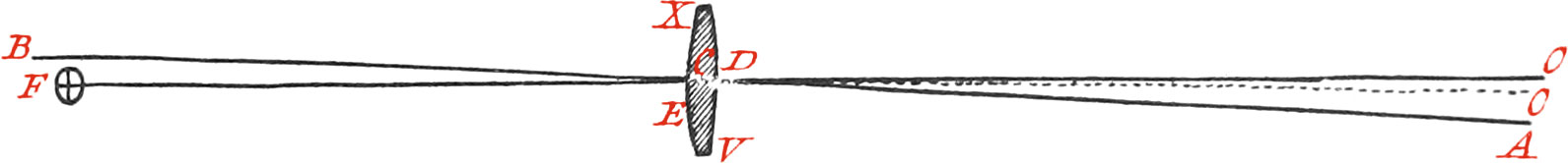 Let XV be a Glass Lens, it’s Axis ACB, and it’s Center C; let F be the Point wherein the Hairs cross one another without the Axis ACB. If from the Point F, which by Construction is at the Focal Distance from the Lens, Rays pass thro’ the Glass, they will suffer a Refraction at their Entrance into the Glass, and a second Refraction at their going out thereof; after which, they will continue their way parallel to one another. Now there is one of these Rays, namely, FE, which coming from the Point F, after the first Refraction in the Point E, passes thro’ the Center C; for after a second Refraction at it’s going out of the Glass in the Point D, it will continue it’s way from D to O, parallel to FE, according to Dioptrick Rules. But all the Rays separated at their going out of the Glass may be taken as parallel, if they tend to a very distant Point O, therefore they are also parallel to the Ray FEO, which is produced from the Object directly to the Point O; and it is this Right Line FEO, which we call the Line of Collimation, in the aforesaid Position of Telescopes, and it will always remain the same, if the Situation of the Glasses be not changed, that is, if the Lens and the Cross-Hairs are in the same Position and Distance. The Object O being in one of the extreme Points of the Right Line FEO, will be represented in the Point F.