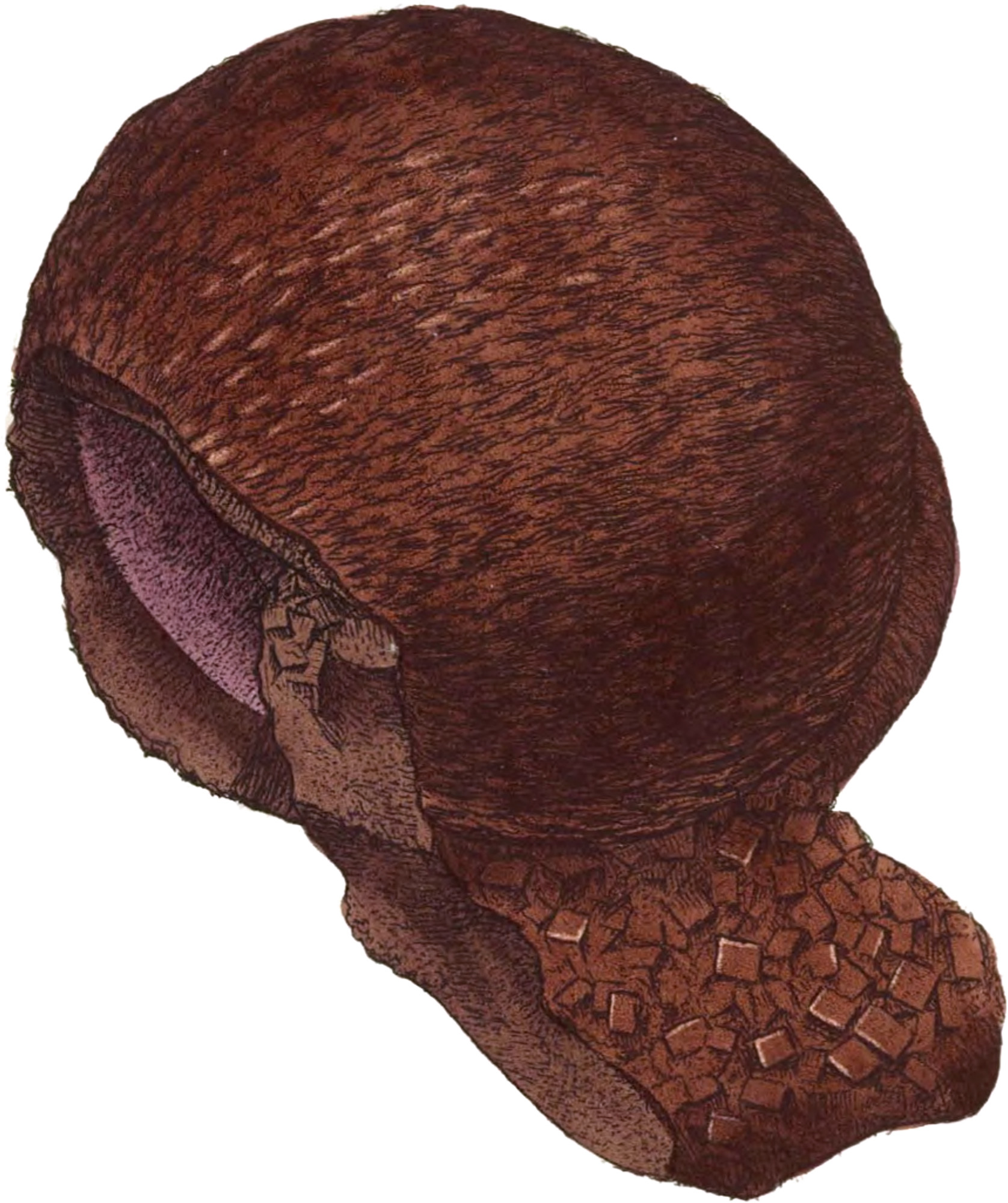 This specimen, although generally speaking it might be called an Hæmatitic Iron Ore, having most of the characters belonging to it, differs from that substance in not being striated, and in having more of an earthy fracture; it however may be placed near the Hæmatites, Whether it is a cast or change after crystallization may be difficult to determine. The lump at first looks like a globular Sulphate of Barytes (see tab. 96.) with the plated or tabular Crystals standing edgeways, but these are probably derived from the decomposition of Pyrites; they are however each of them so much blistered or covered with bubbles (see the right hand side of the lower figure, tab. 56. a formation common to many Hæmatites) that they cannot be made out. The hollow is lined with very thin-edged, probably tabular, Crystals, belonging to those of tab. 60. These are covered with a dark red or somewhat crimson powdery glimmer, sparkling like that of tab. 64. The stalk, or lower part, seems to have been cubical Iron Pyrites: see tab. 29 and 30, which are externally covered with bubbles. Possibly the whole once formed a Sulphuret of Iron or Pyrites, and having lost the Sulphur has become a mere Oxide of Iron. Such fortuitous circumstances as this was formed by, sometimes give the shapes of pears, apples, lemons, &c. which are as highly valued as if true petrifactions, and are very often difficult to be accounted for, especially by those who have not seen a series of specimens.