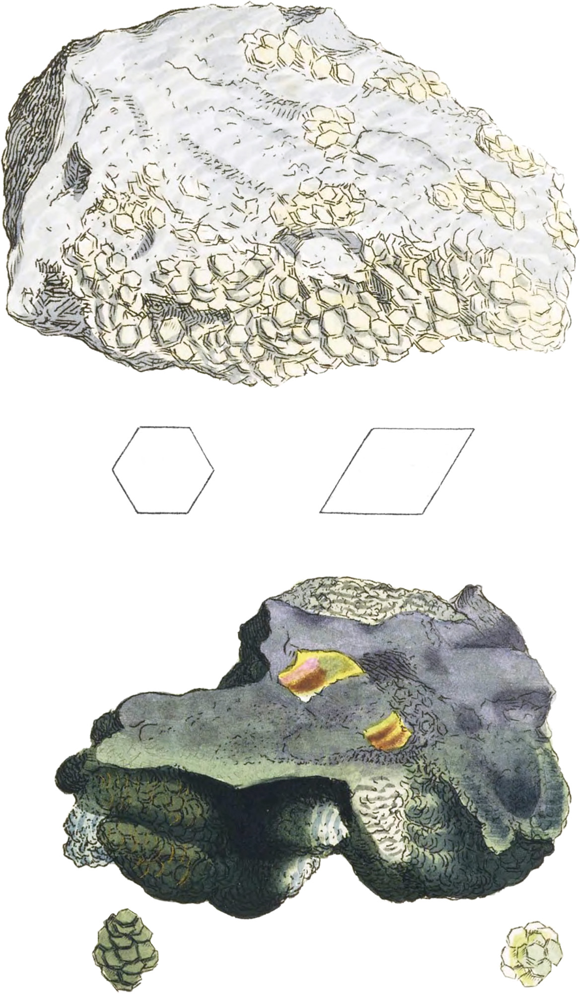 The upper specimen came from Stenna-Gwyn in Cornwall, where it is found in abundance, often holding Phosphate of Lime, among Quartz, and decomposing Feltspar; whence the rock itself is often called Apatite, the old name for Phosphate of Lime, Abundance of Oxide of Tin often accompanies it. This is a variety of Talc, agreeing with that called Chlorite in every external character except colour, which instead of being green is that of cream.