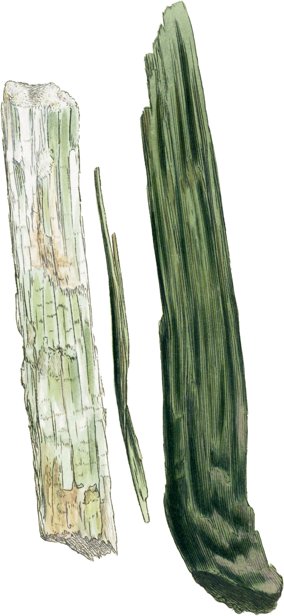 This substance has been long known in the Isle of Skye. I believe it has not been discovered in Ireland, but may perhaps be found in North Wales. The length of the fibres in the present specimen gives it a remarkable appearance, and the leek-green varieties but faintly convey the idea of a stone, particularly in a figure. It is scarcely flexible, except in very small fragments, al though it has that appearance, especially the middle twisted piece. It is finely fibrous in its divisions in some parts, in others rather solid and plated. Fragments splintery, breaking with hanging fibres. Lustre rather internal, partly pearly. To the touch it is smooth and softish, scarcely greasy; is readily scraped with a knife, and is somewhat transparent at the edges. The lighter left hand specimen is more solid, and mixed with the amianthine rock, in a curious semi-detached manner; breaking at right angles, The varieties between these may include most known, as there are but small differences. It sometimes approaches Lapis nephriticus, which is more solid, tough, and hard.—Spec. Grav. from 2.547 to 2.995.