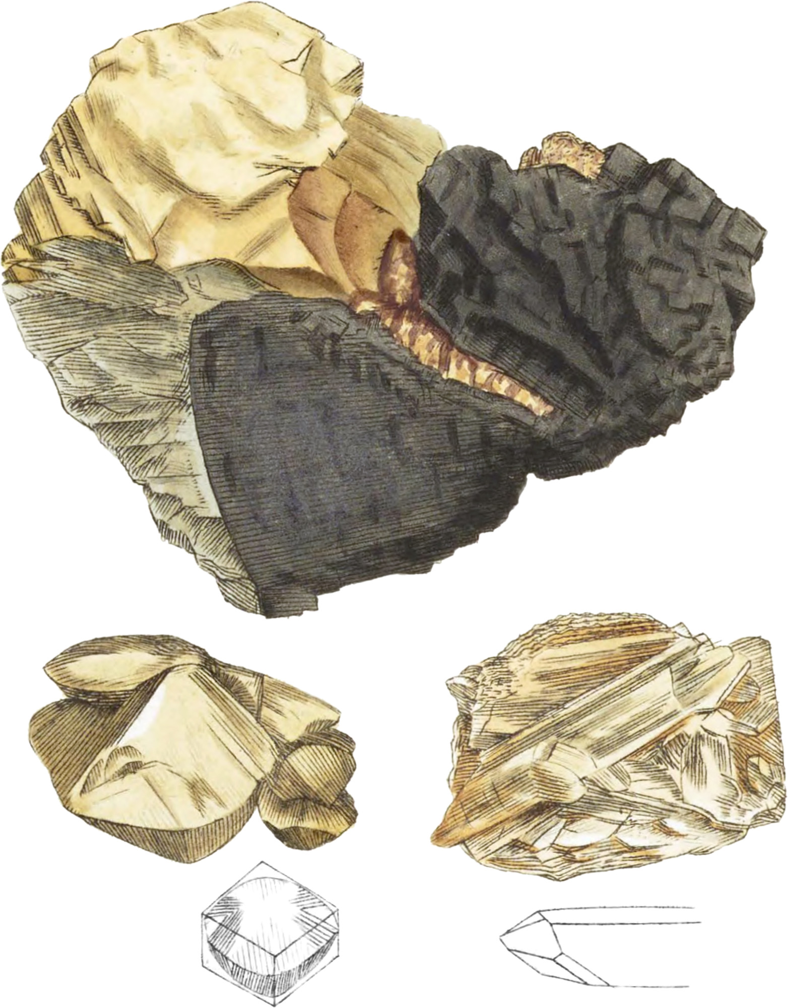 The left hand figure represents a large, almost lenticular crystal, cor responding nearly in form with some minute ones from Anglesea. I suppose this to be from Derbyshire; it was in Mr. Day’s collection.