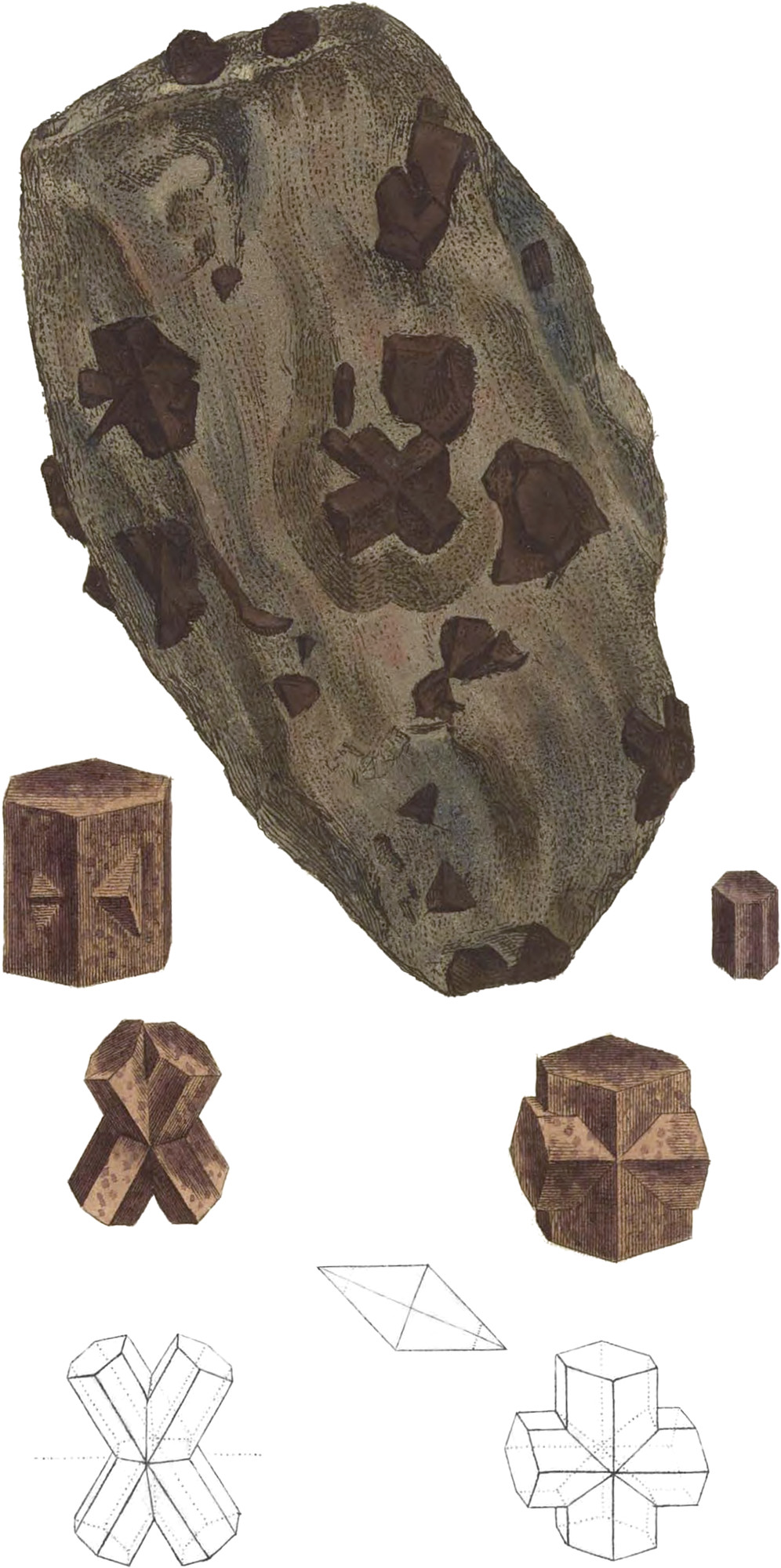 The upper figure, with the crystals in the matrix, is by favour of my very ingenious friend, Wilson Lowrie Esq. from Brittany, and shows a great variety, which, however irregularly they seem disposed, depend on the abovementioned regularity, although they might give some idea of the accidental heaping of some other substances. The lower figures, which I have sometimes made as geometrical ones, are by favour of Dr. McCulloch.