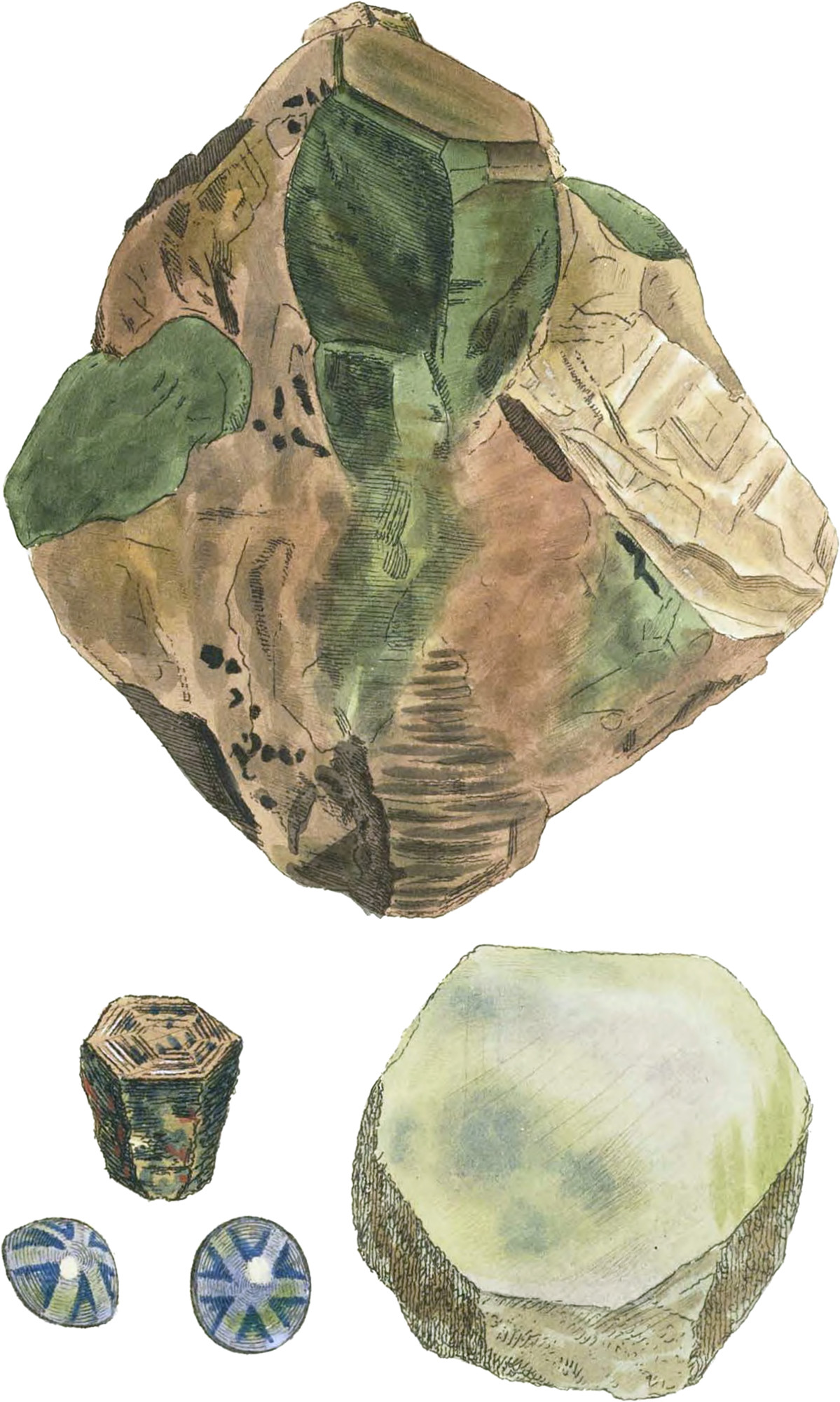 The lower figure on the right hand is part of a large crystal from the Carnatic, for the figure of which I am indebted to the Trustees of the British Museum; it shows the horizontal fracture and common colour of that variety of Corundum.