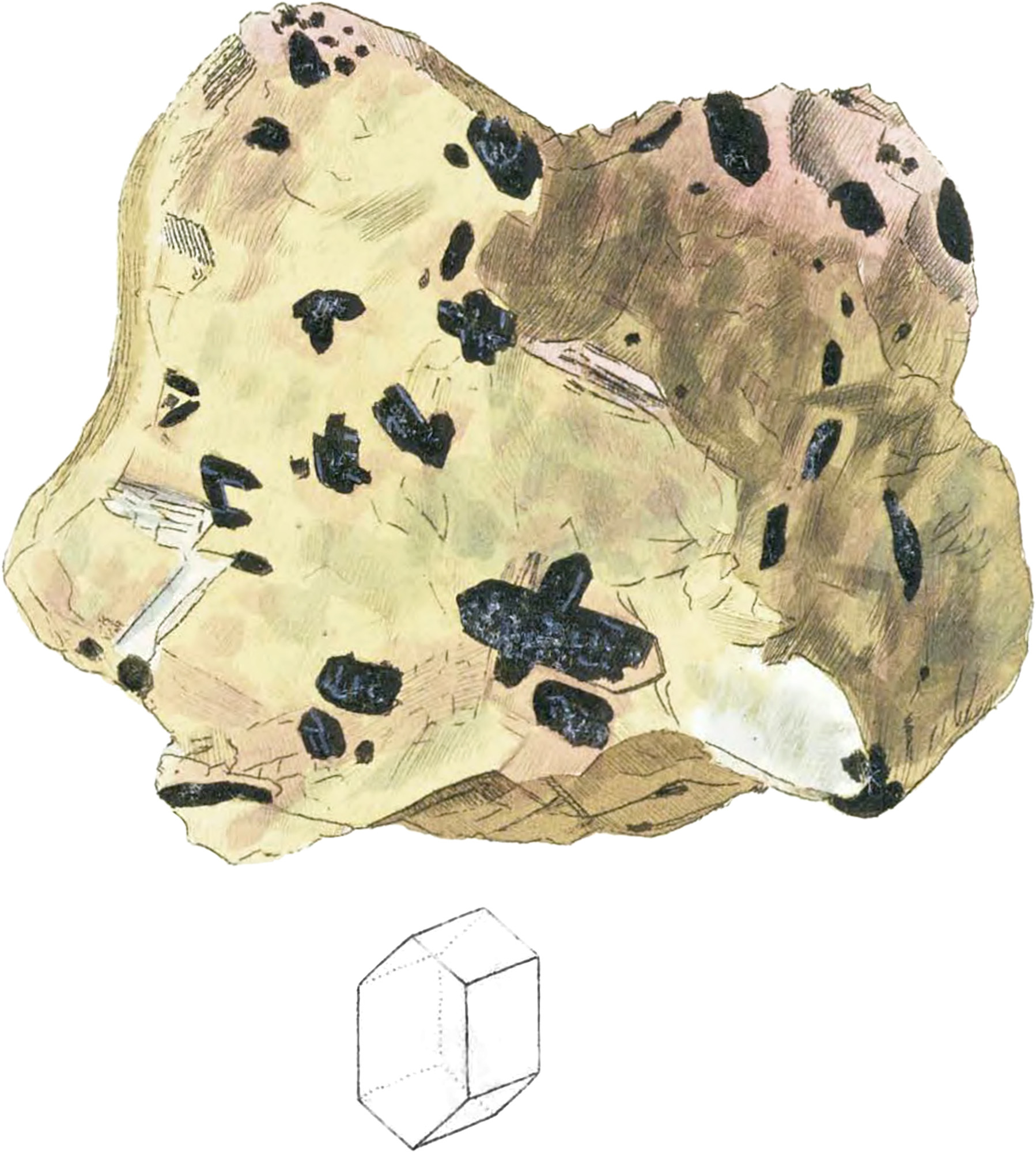 The present remarkably fine specimen of Yttrio-tantalite, from Ytterby in Sweden, is in the collection at the British Museum. The substance is dispersed through Feldspar, Quartz, and Mica, in a manner very much resembling Feldspar in some Porphyrys, apparently in imperfect crystals, crossing, and were it white or reddish instead of a fine coal black, it might have been passed over as Feldspar in Porphyry. It does not appear that any one has been able to discover the form of the crystal, and it can only be understood in part without spoiling the present specimen. We however venture a hint at its form in the outline below collected from various sections shown on the specimen. It appears to be a rhomboidal prism terminated at each cut by two rectangular faces. The hardness is moderate; in general it opaque, with the blackness and lustre of coal, but sometimes transparent and greenish brown in small fragments. The fracture is rather splintery and resinous. Spec. Grav. 5.130. According to its discoverer it is composed of Tantalium united to Yttria and Iron; according to Vauquelin it contains Oxide of Tantalium 45, and the remainder Yitria and Iron.