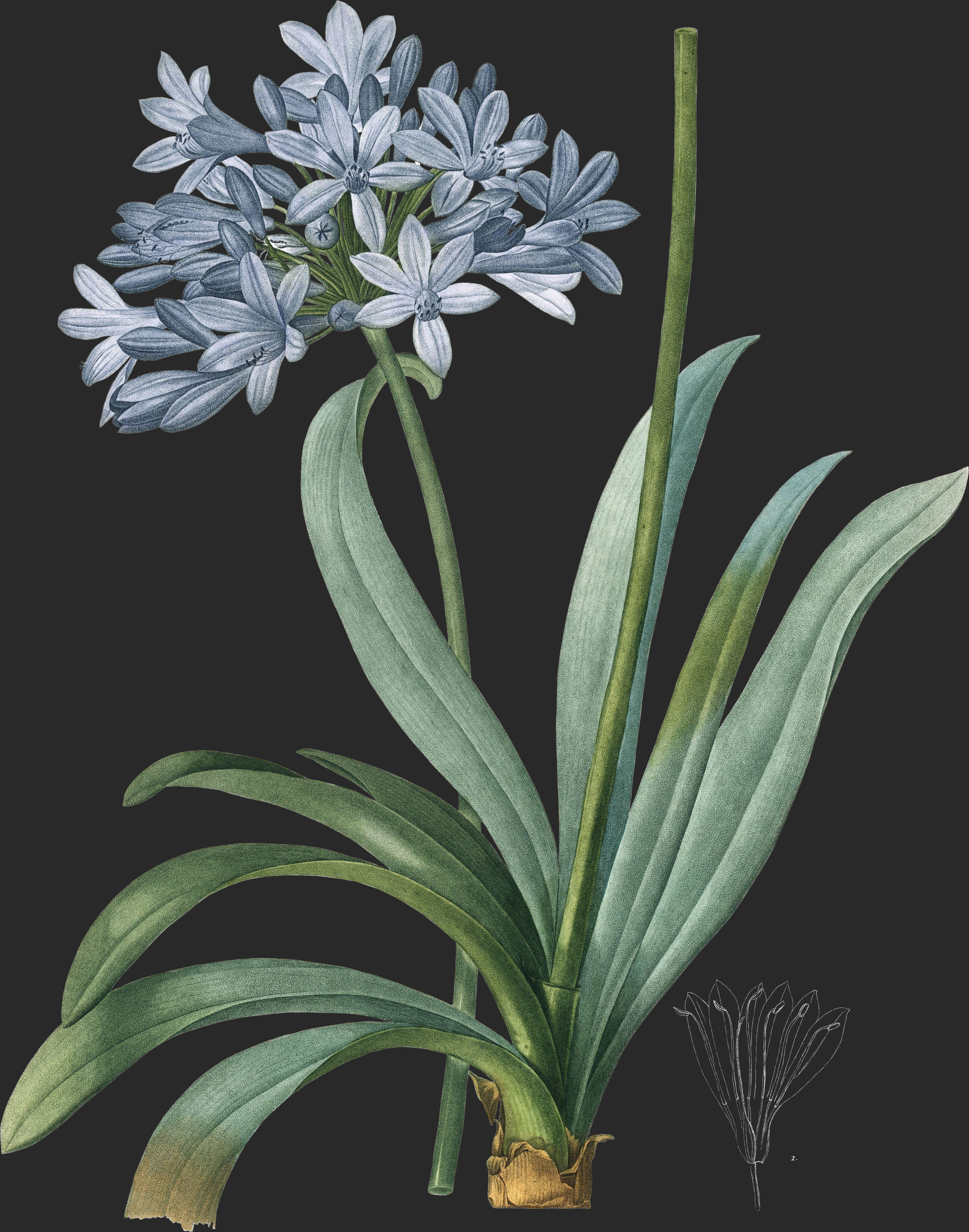 L’Agapanthe en ombelle, que les jardiniers nomment Tubéreuse bleue, fleurit en été dans nos jardins. Il en fait l’ornement par la beauté de ses fleurs, mais on regrette, en les voyant, qu’elles soient dépourvues d’odeur.