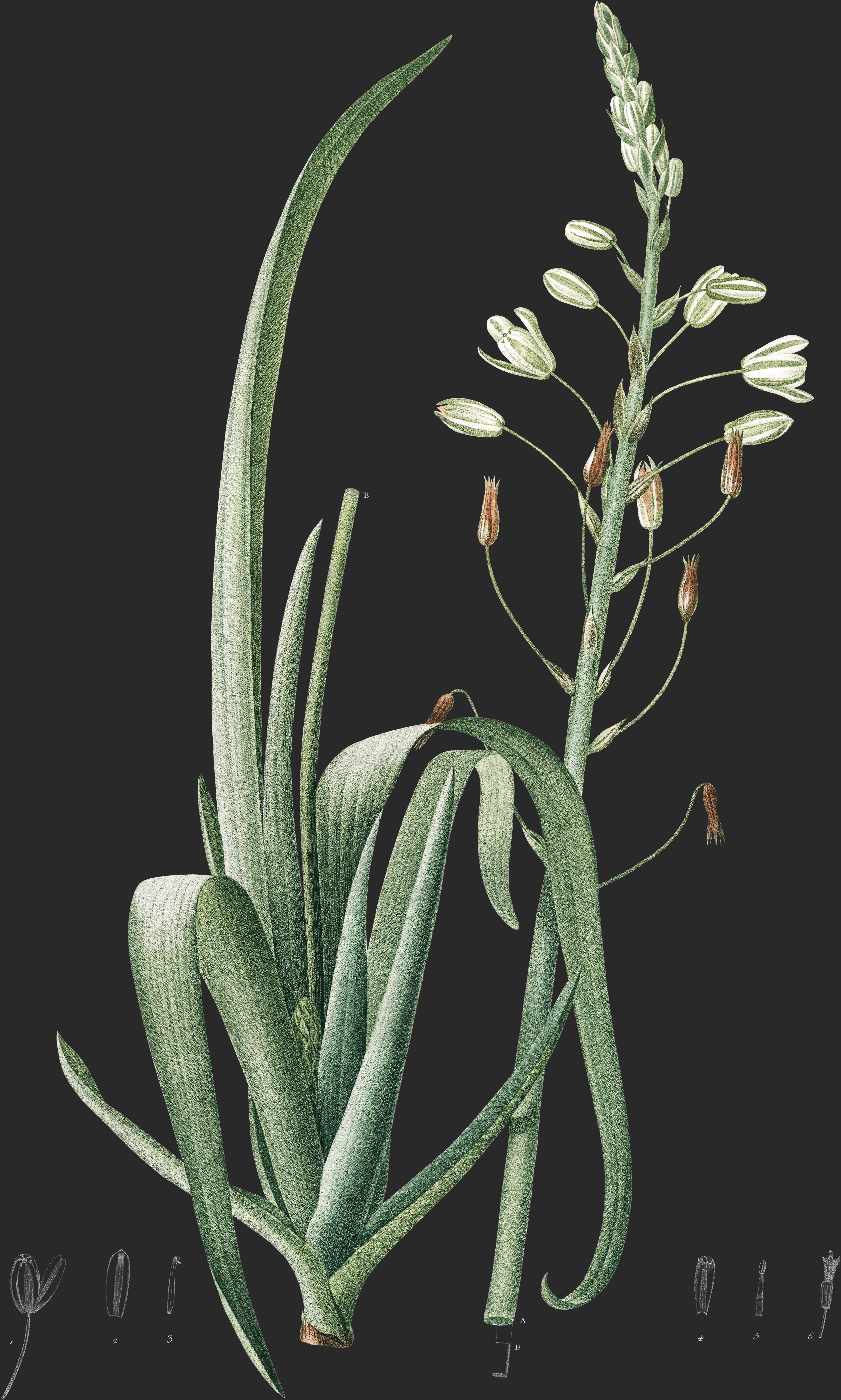 La hampe qui sort du milieu des feuilles est droite, nue, glauque, terminée par une longue grappe de fleurs, plus petites que dans l’Albuca à large feuille; chaque fleur est placée au sommet d’un pédicelle grèle, droit, long de 4 centimètres a l’époque de la floraison, nullement recourbé au sommet, de sorte que la fleur n’est point penchée; sous chaque pédicelle est une bractée concave, embrassante, pointue, longue de 2 centimètres au plus.