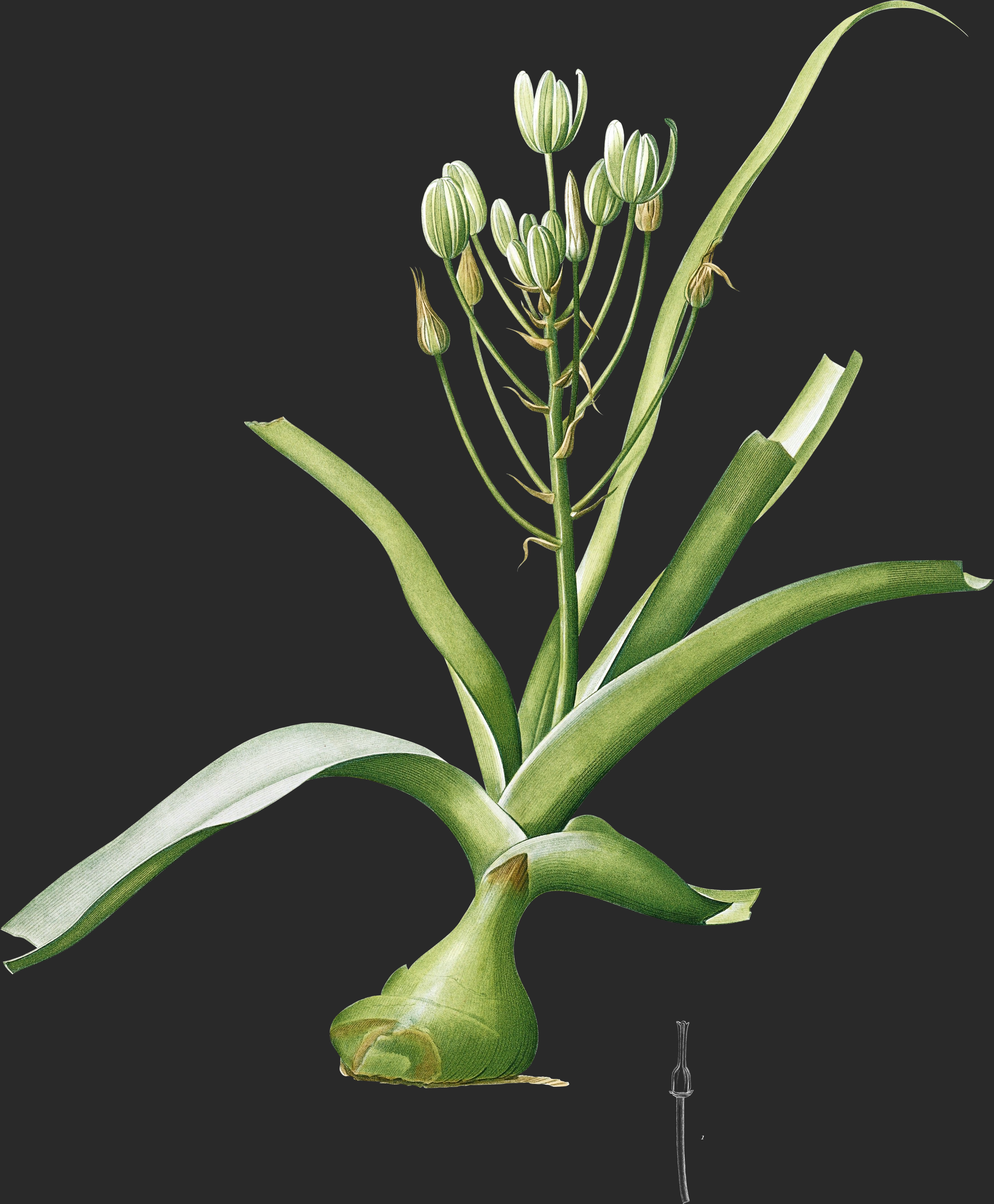 Bulbe verte, noueuse, formée au-delors de tuniques charnues, en bourrelets, au contour supéricur desquelles reste une cicatrice brune, sphacélée, qui résulte de la chute de la lamo des anciennes feuilles. Une sorte de tige de vingt-sept millimètres de haut (un pouce) part immédiatement de la bulbe, et consiste dans un faisceau que forment les feuilles avant de s’étaler; quatre à cinq lenilles lanceolces, aigues,ea ruban, en goutiere en dessus, treslinement cilices sur les bords, s’écartent presque horizontalement, faisant l’are et retombantes par leur sommet. Les feuilles extérieures sont longues de trois décimètres (un pied), larges de cinq centimètres et demi (deux pouces). Les intérieures, moitié plus étroites et d’un tiers plus courtes que les extérieures, sont pliées en gouttière arrondie, presque cylindrique.