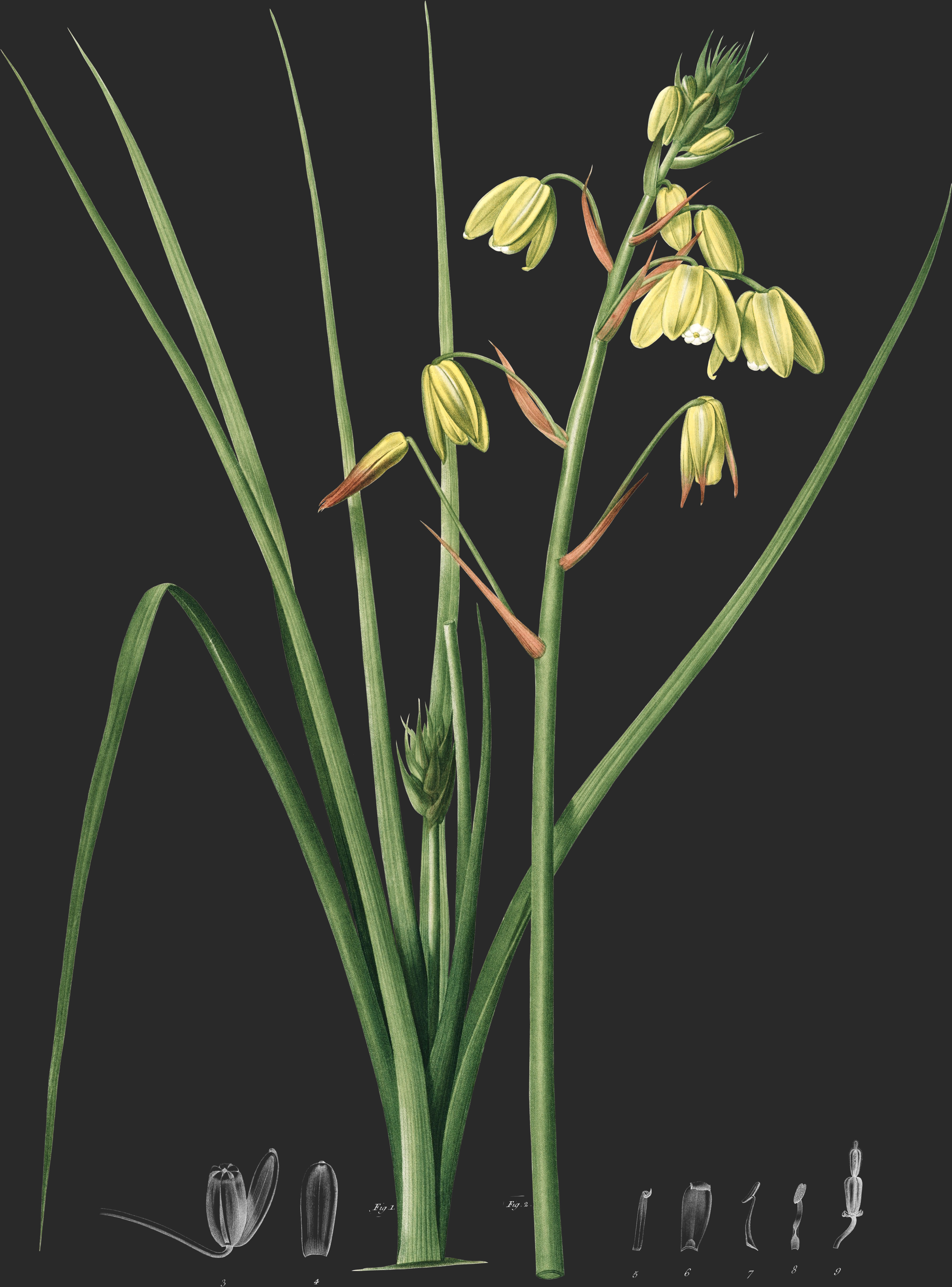 La hampe s’élève à la hauteur de 8 à ro décimètres, et porte une longue grappe de fleurs jaunatres, assez écartées, surtout après la fécondation, à cause de l’alongement de l’axe, portées chacune sur un pédicelle courbé à l’extré mité, de manière que la fleur est pendante; à la base de chaque pédicelle est une bractée large et concave à sa partie inférieure, blanche et membraneuse sur les bords, terminée par une pointe menue, plus longue que le pédicelle avant la floraison, et n’atteignant que la moitié de sa longueur à l’époque de sa maturité.