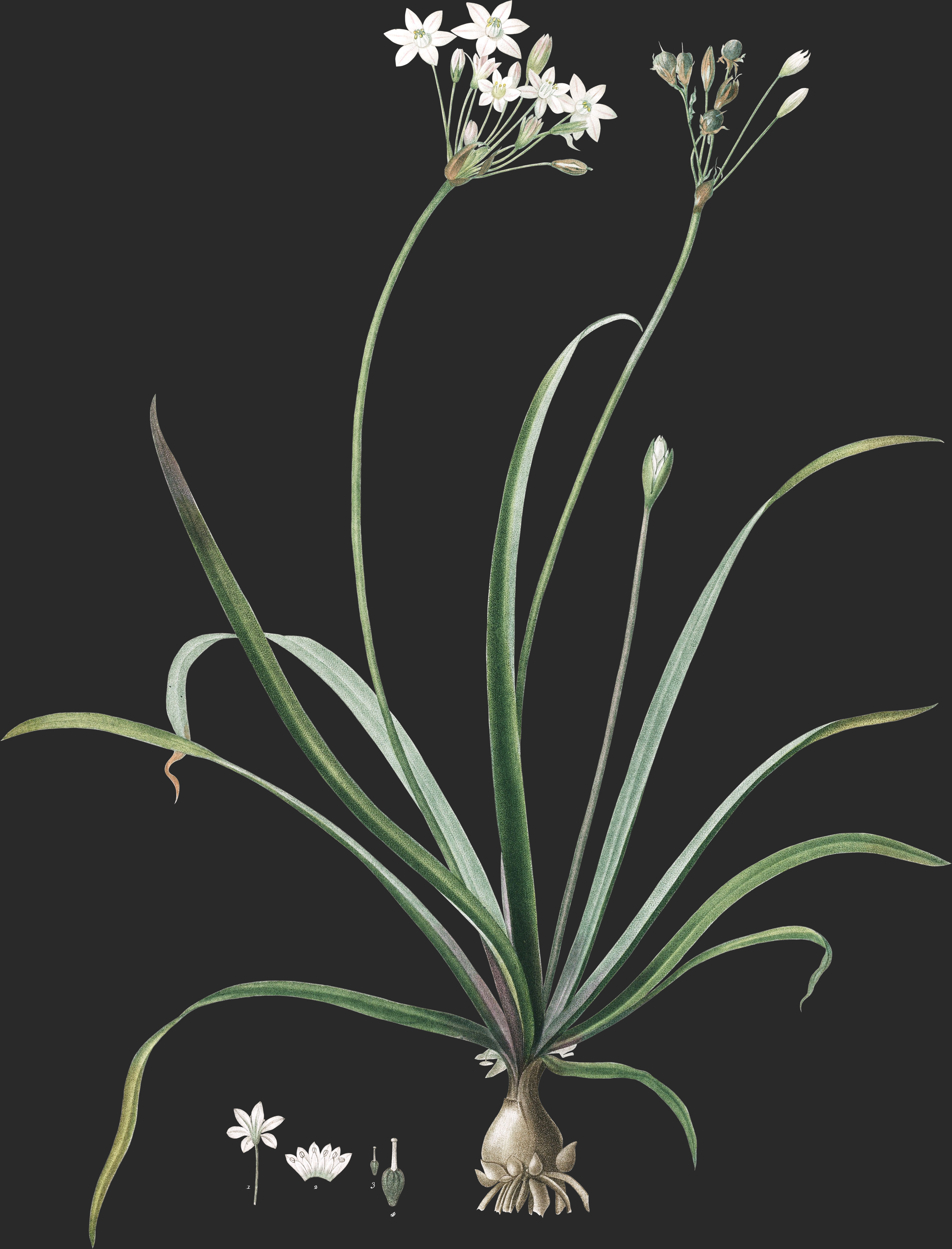 La bulbe est arrondie et blanchätre; de sa surface inférieure sortent des radicules simples et nombreuses; sur les côtés naissent plusieurs cayeux ovales et pointus; de la partie supérieure s’élèvent quelques feuilles radicales, engainantes à leur base, linéaires, obtuses, courbées en forme de gouttière, relevées en dessous par une nervure saillante, glabres, un peu épaisses, légèrement glauques et de moitié environ plas courtes que les hampes; celles-ci sortent d’entre les feuilles, et s’élèvent à 4–6 décimètres de hauteur; elles sont nues, cylindriques, et sortent successivement d’une même bulbe.