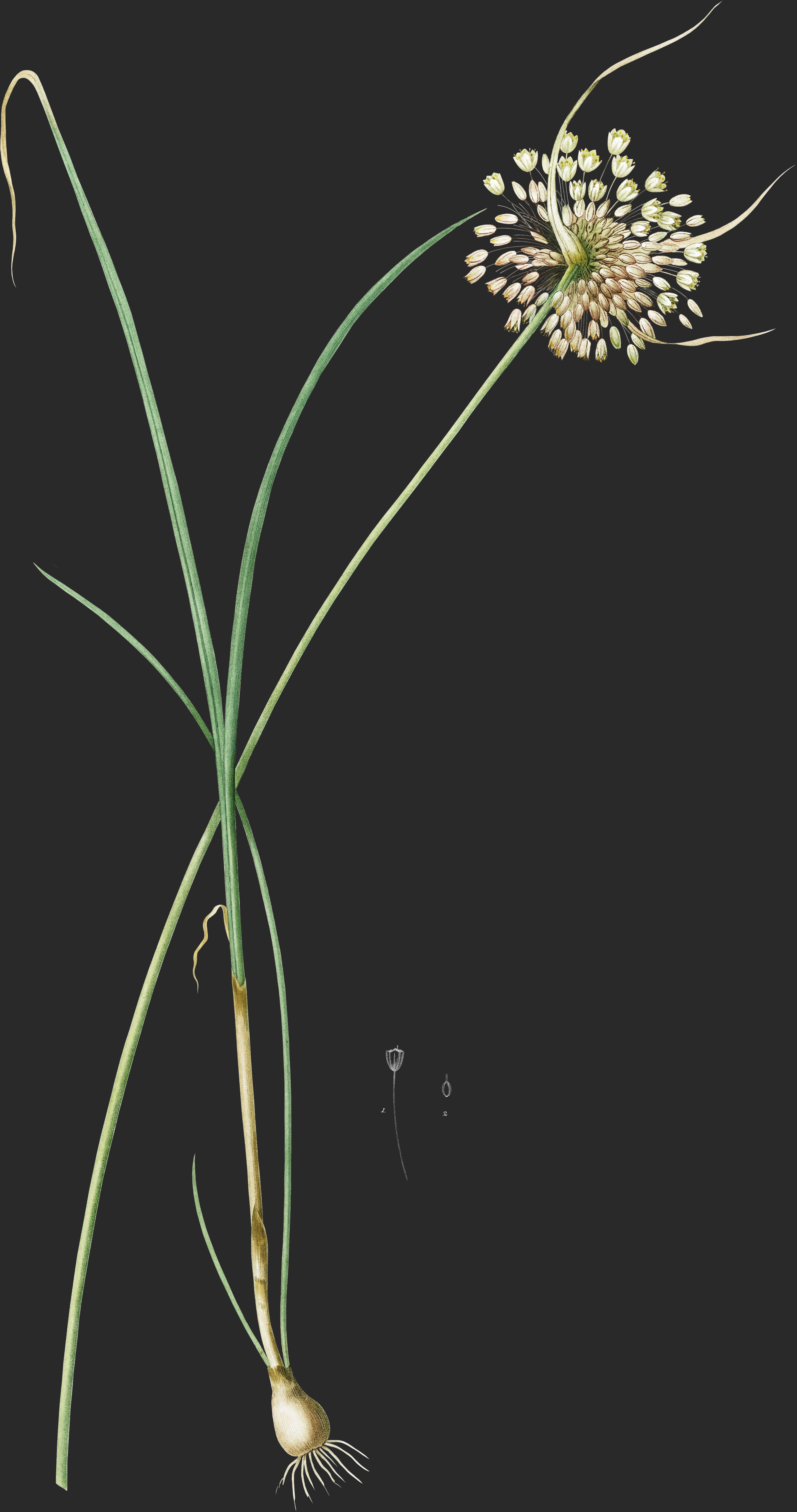 Les fleurs, quoique très-nombreuses, forment une ombelle lache, irrégulié-rement arrondie, assez semblable à celle de l’Ail en panicule, le plus souvent dépourvue de bulbes, mais en présentant quelquefois une ou deux assez grosses parmi les pédicelles. Ceux-ci sont grèles et longs de trois centimètres environ. La spathe est formée de deux valves lancéolées, concaves, persistantes, rétrécies au sommet en une pointe trèsallongée. L’une d’elles atteint la longueur d’un décimètre environ, et l’autre celle d’un décimètre et demi.